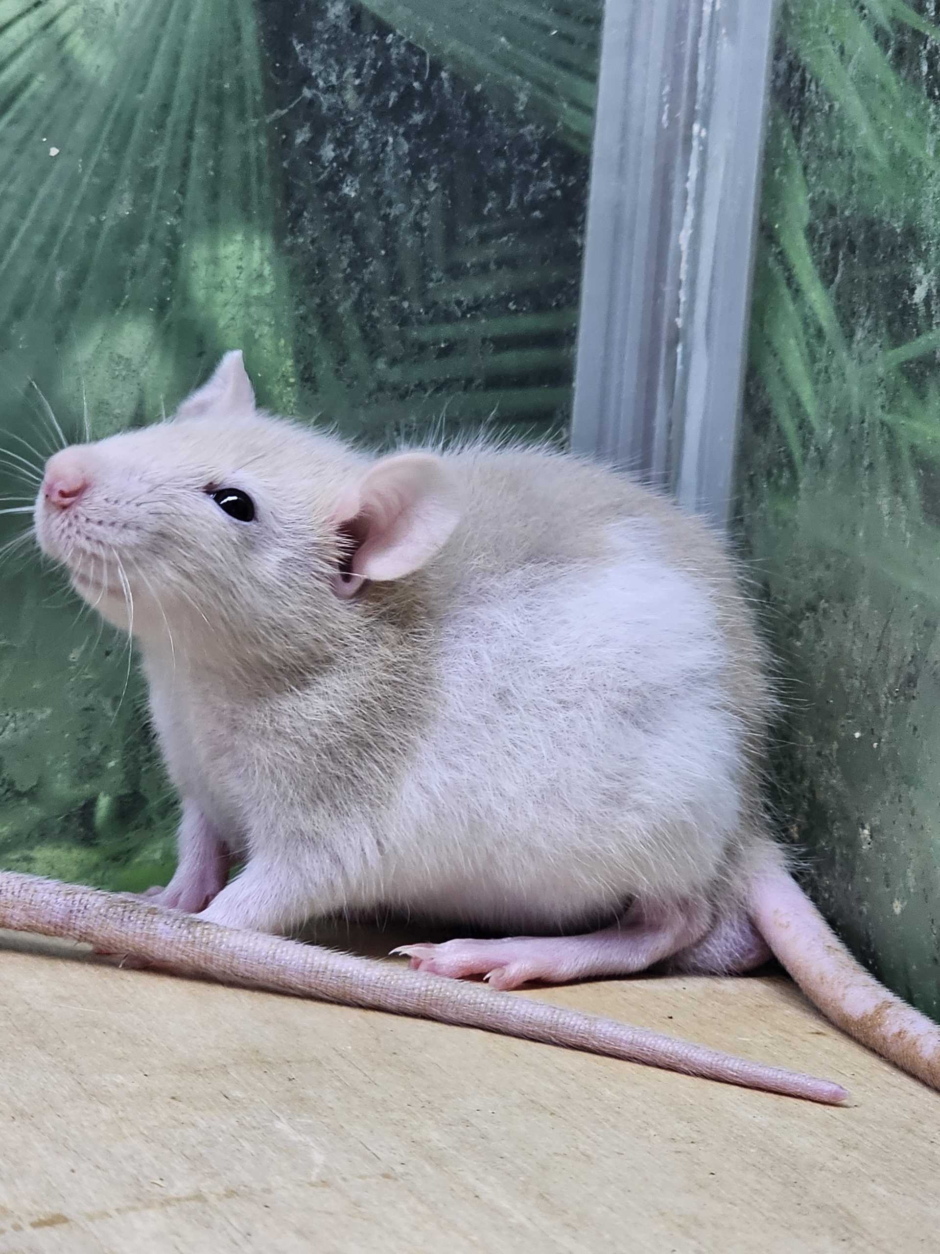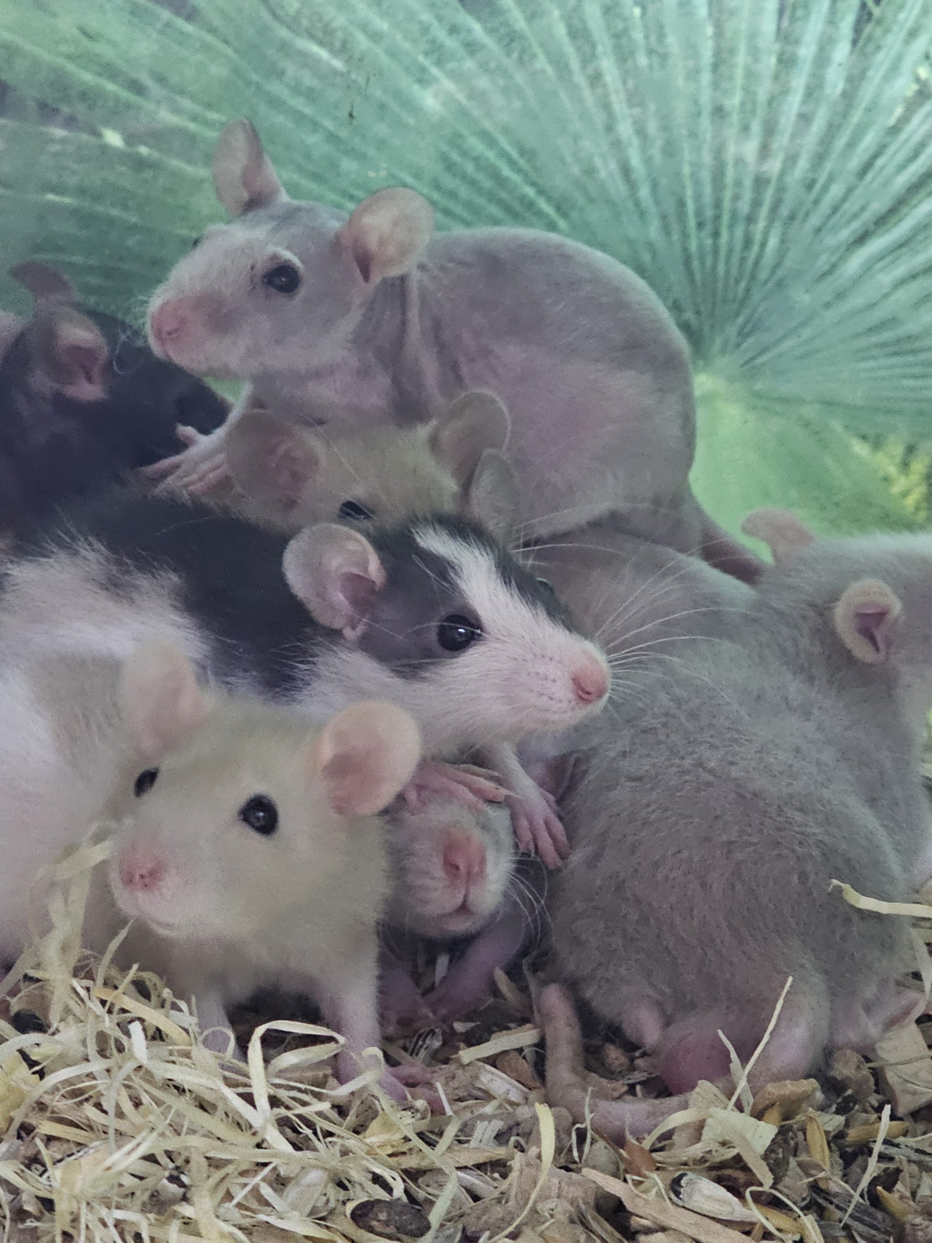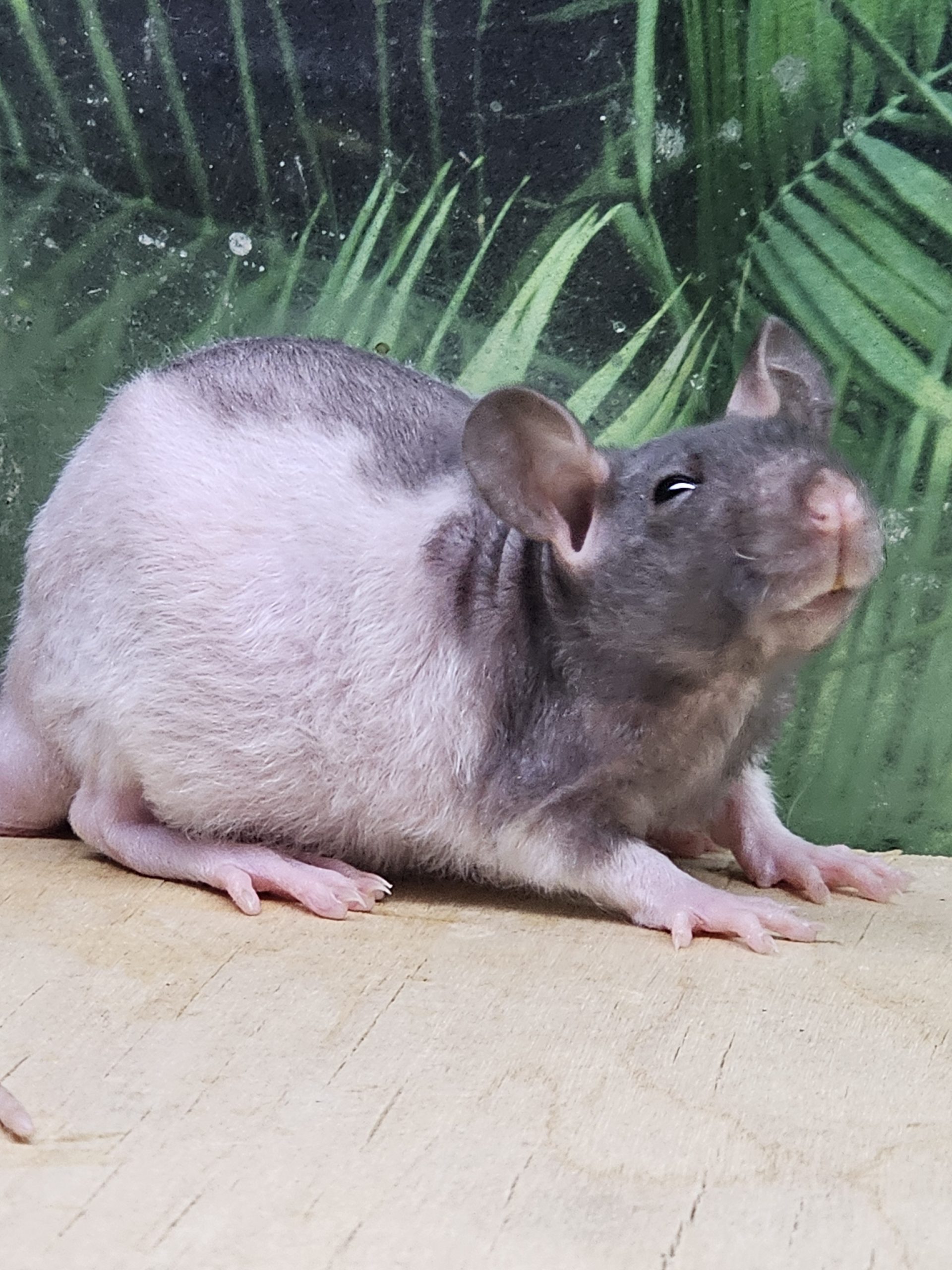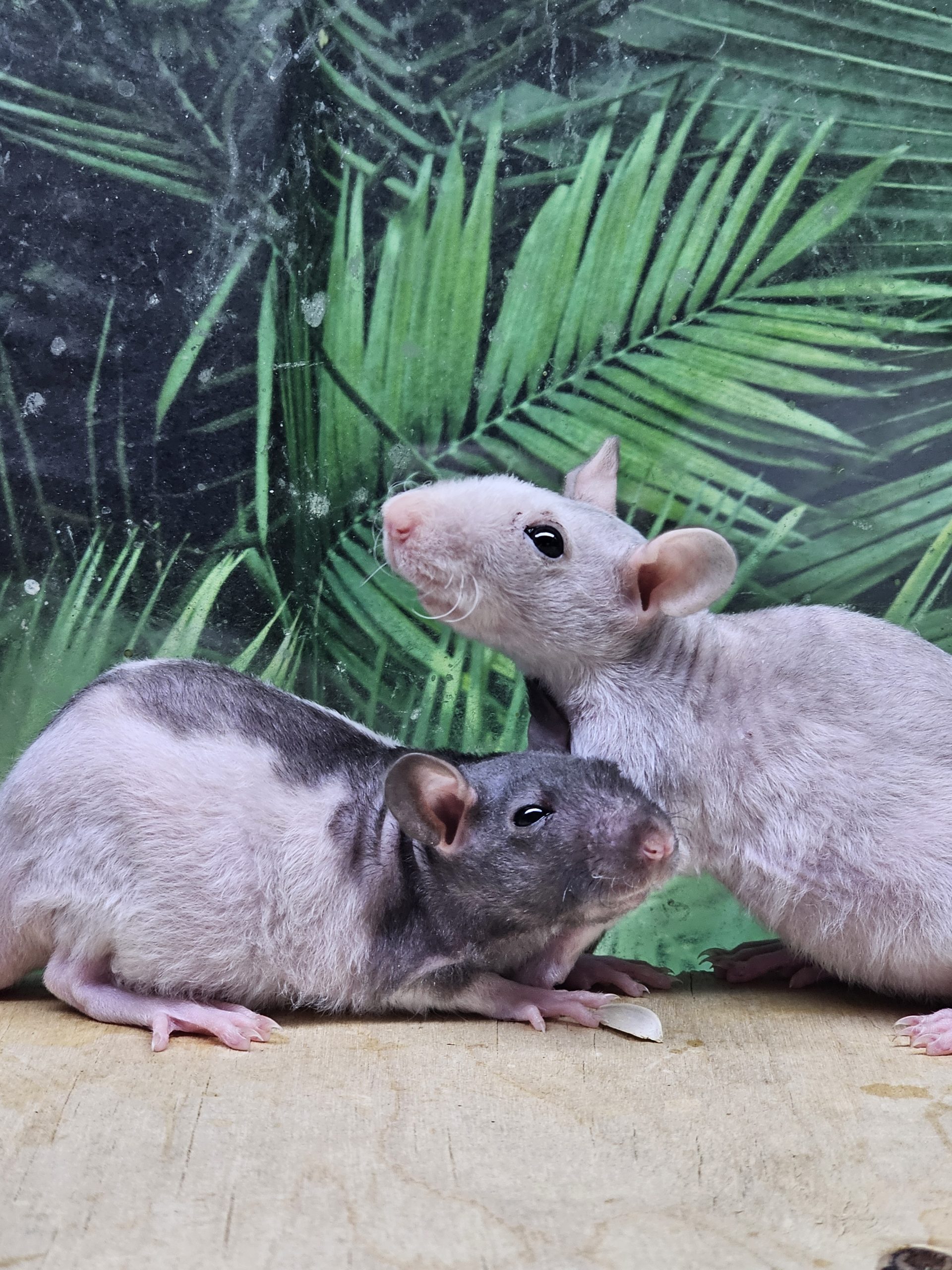 Nakurottia ja tavallisia peruskarvaisia kesyrottia.