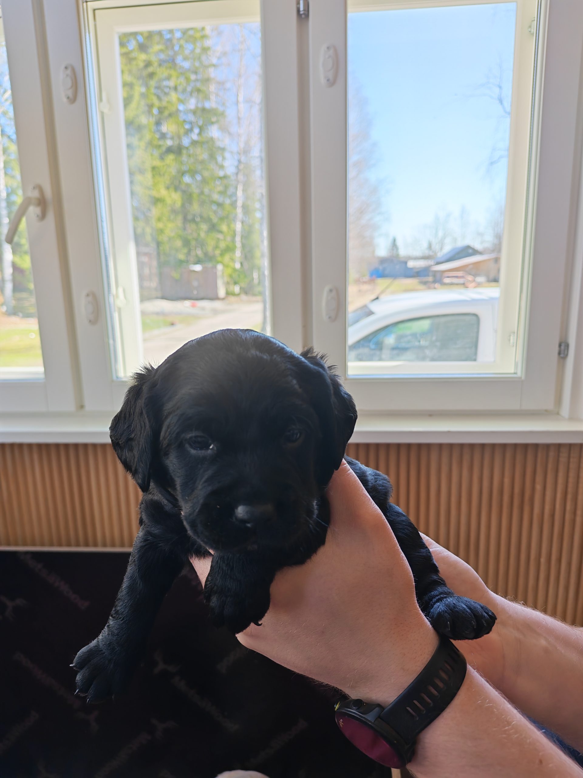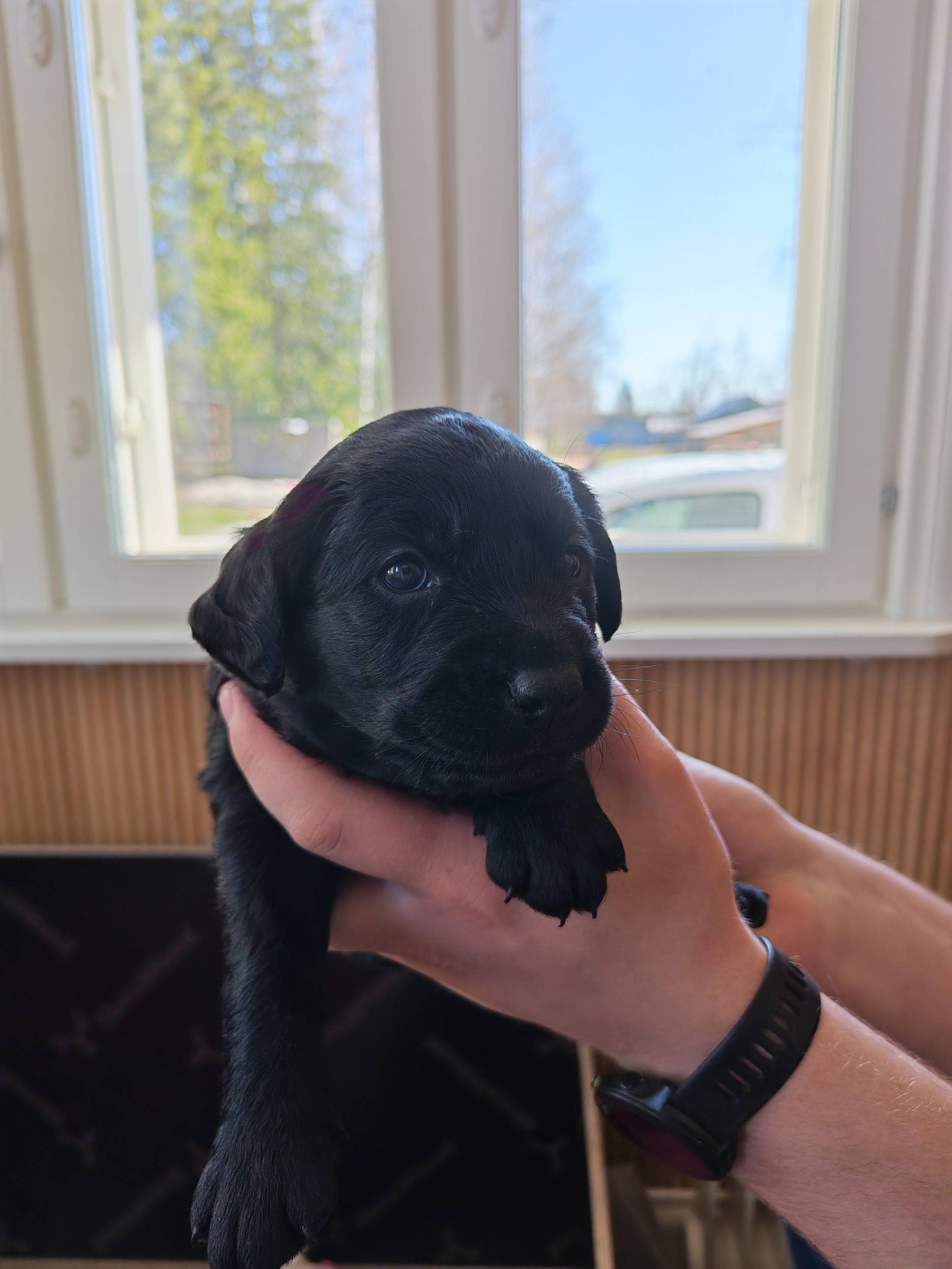 -emä: musta noutaja, kiltti ja tasainen luonne. Paino 25 kg.