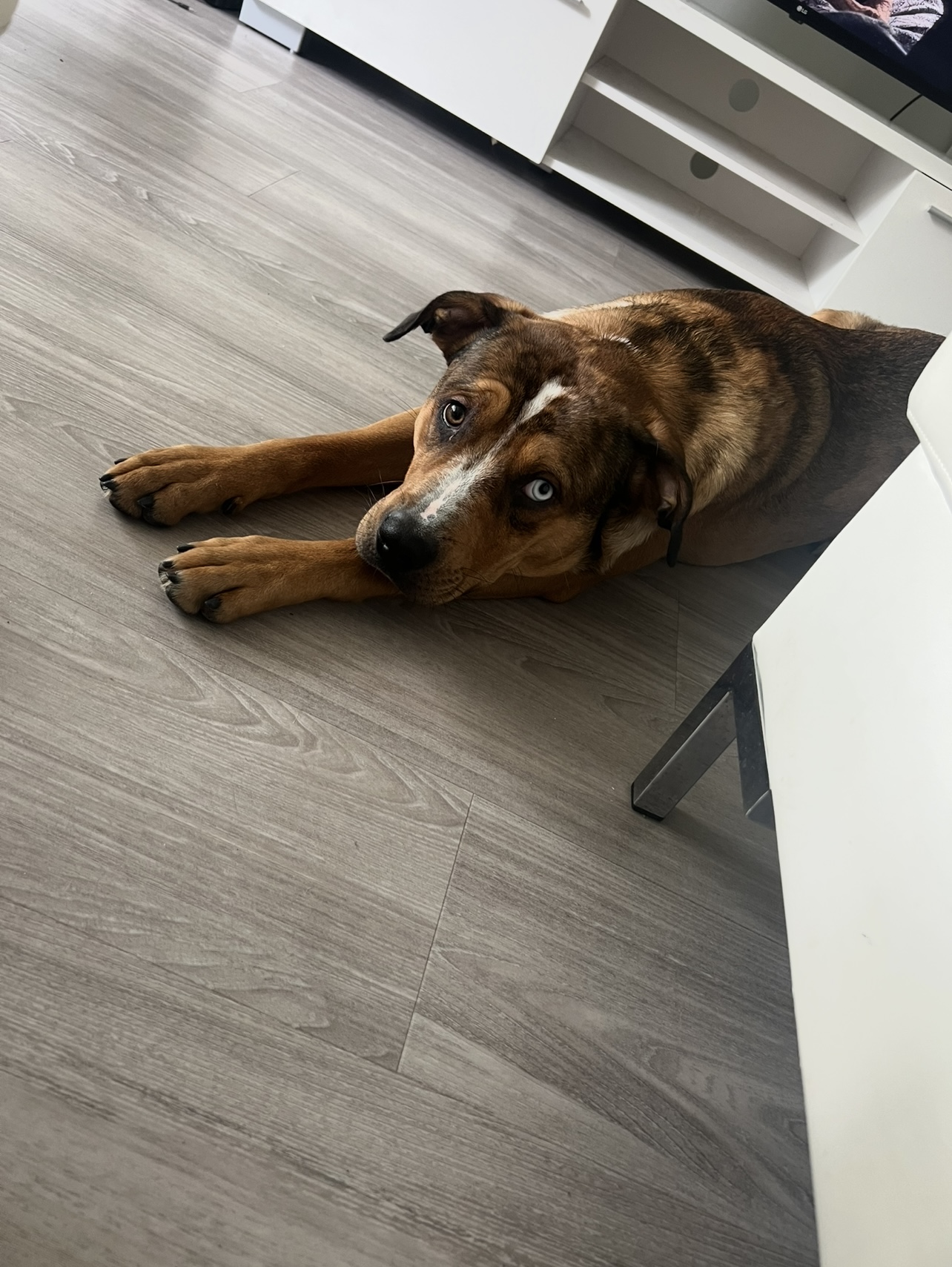 Koira on arka ja kaipaa vielä koulutusta, sekä kodin, jossa on aikaa ja osaamista, opettaa koiraa mm. kulkemaan remmissä, saada pelkotilat pois lenkillä yms. Koira myös osottaa mieltään pissailemalla sisälle välillä kun jää yksin.