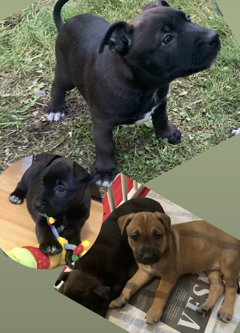 Pennut ovat kasvaneet osana lapsiperhearkeamme ja ovat täten tottuneet lapsiin, tavanomaisiin kodin ääniin ja käsittelyyn. Emä on staffi, isä puolestaan saksanpaimenkoira. Vanhemmista ja pennuista lisätietoja annan mielelläni whatsapp / puhelimitse. Ovat saaneet eläinlääkärin tarkastuksen ja sirutuksen. Madotettu kahden viikon välein.