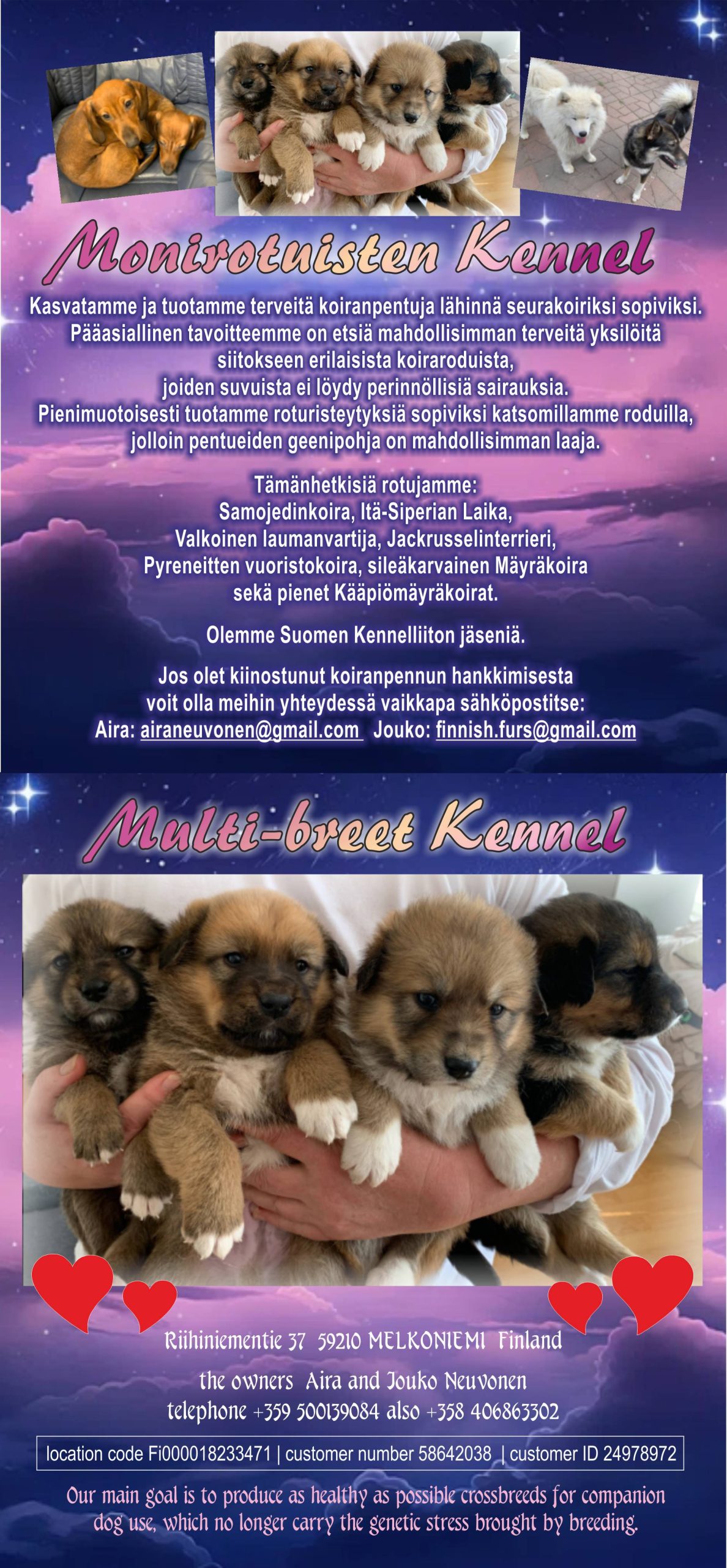 Toivomuksemme olisi tutustumiskäynti jos se suinkin on mahdollista.. silloin voi kunnolla tutustua pentuihin ja niiden vanhempiin. Ystävällisin Terveisin Jouko & Aira